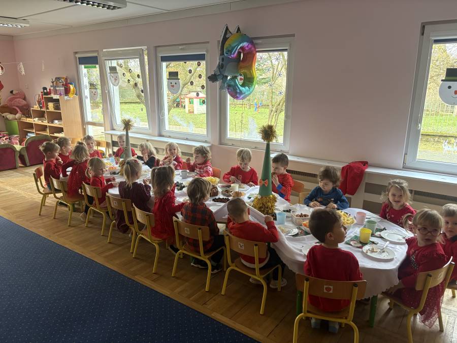 19 grudnia w każdej grupie w przedszkolu odbyły się uroczyste Wigilie. Dzieci wspólnie z paniami zasiadły do świątecznego stołu, który uginał się od smakołyków🥟🥮przygotowanych przez rodziców 🙌. Wszyscy złożyliśmy sobie życzenia przy dźwiękach kolęd i cieszyliśmy się tym wspólnym, cennym czasem😍. Spotkanie sprzyjało kształtowaniu tradycji, życzliwości i wzajemnego szacunku.