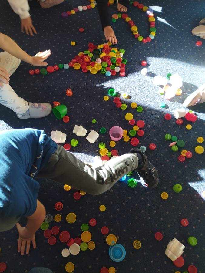 Niezapominajki podczas zajęć matematycznych rozwijały umiejętność liczenia z wykorzystaniem kolorowych zakrętek. Dzięki zabawie w przeliczanie, porównywanie i tworzenie zbiorów uczyły się koncentracji, logicznego myślenia oraz doskonaliły motorykę małą. Zakrętki stały się atrakcyjnym, prostym i ekologicznym materiałem dydaktycznym.