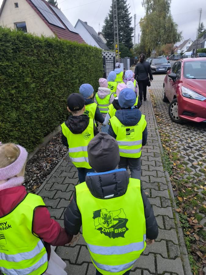 Grupa Niezapominajki świętowała Dzień chleba odwiedzając mini piekarnię w pobliżu przedszkola. Na zdjęciu dzieci wracają już z wycieczki. Teraz będą dzielić się pysznym i chrupiącym chlebkiem.